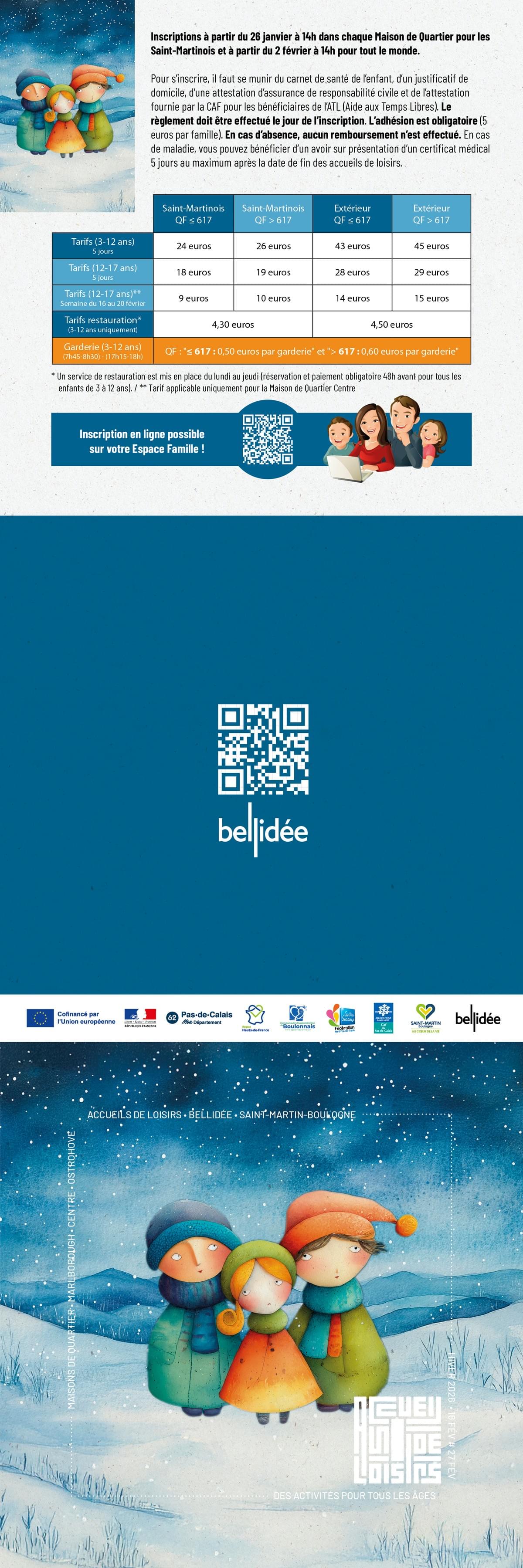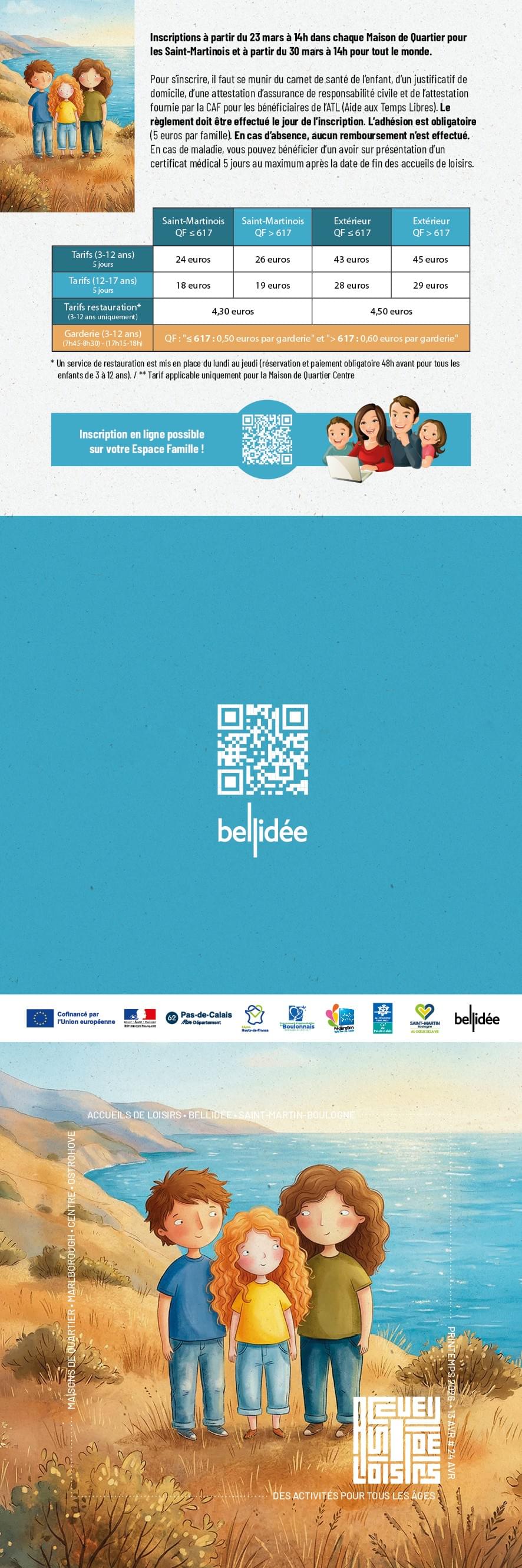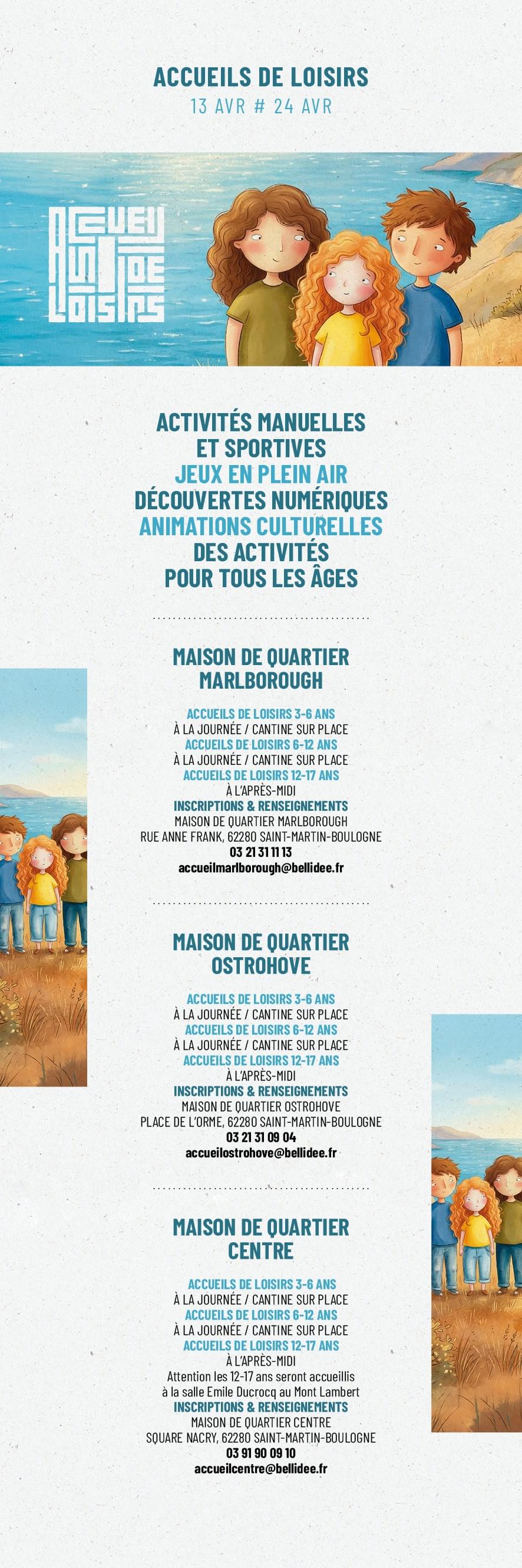 Dates des accueils de loisirs : Automne 2025 du 20 octobre au 31 octobre / Hiver 2026 du 16 février au 27 février / Printemps 2026 du 13 avril au 24 avril / Été 2026 du 06 juil au 21 août. (Informations et inscriptions, contacter votre maison de quartier : Marlborough, Ostrohove et Centre).